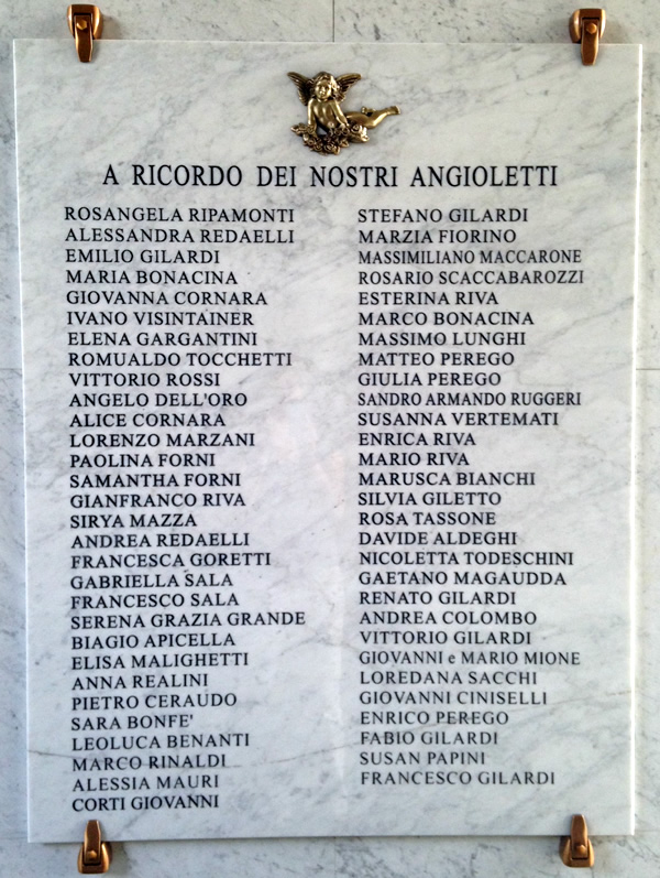 Un sessantina i nomi dei bambini che vi trovano posto, sulla parete di fronte all’ascensore che porta al piano superiore del complesso dei loculi. Non appaiono date incise, e una semplice croce in legno e una fioriera completano l’omaggio alle giovanissime vite interrotte prematuramente.