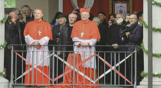 L’arcivescovo Angelo Scola (con la berretta cardinalizia) presso il seminario di Venegono, affiancato dal cardinale Gianfranco Ravasi