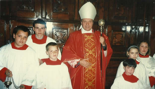 Il vescovo di Mantova mons. Roberto Busti, quando era prevosto di San Nicolò a Lecco, con un gruppo di accoliti della basilica
