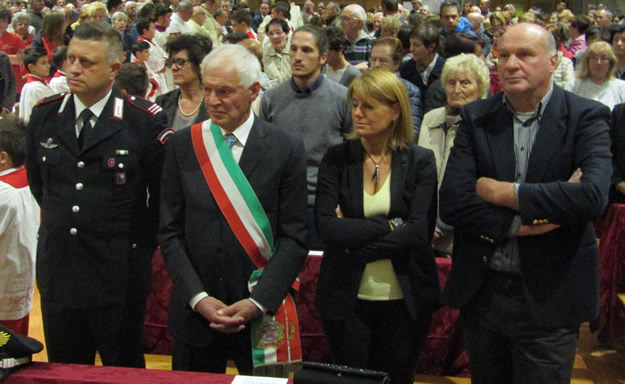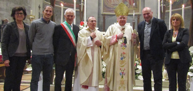 Foto di gruppo con le autorità del Comune di Valgreghentino. Da sinistra: l’assessore Rosa Rita Milani, l’assessore Matteo Colombo, il vice-sindaco Filippo Milani, don Enrico Vitali, il Cardinal Angelo Scola, il consigliere Cesare Perego, l’assessore Maria Grazia Brambilla