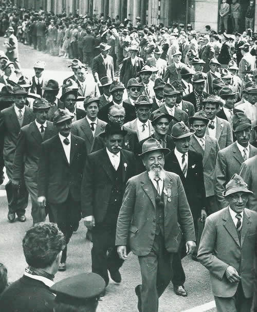 Antonio Valsecchi, riconoscibile per la medaglia e per la barba, mentre sfila all’adunata nazionale 1959, svoltasi a Milano