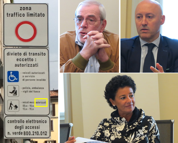 A sinistra il cartello ora presente all'ingresso della Ztl. Quello affisso prima del 15 ottobre 2013 era identico, senza la specifica "autorizzati" evidenziata nel riquadro giallo. A destra, in alto Peppino Ceresa e Alberto Riva. Sotto l'avvocato Giulia Aondio