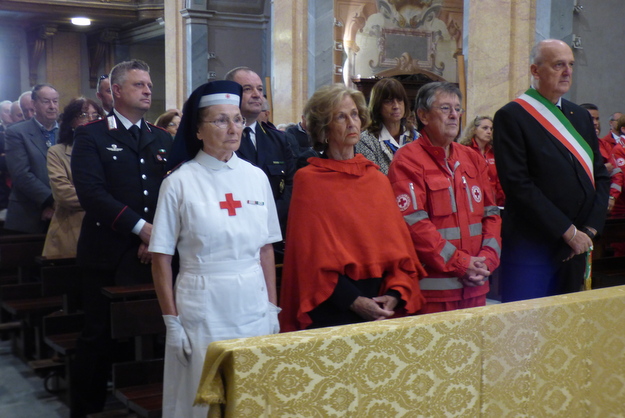 Intorno alle ore 10 un lungo corteo guidato dal Corpo Musicale di Galbiate e composto da rappresentanti dell'amministrazione, delle forze dell'ordine, delle associazioni, di altre sezioni della CRI e dai volontari galbiatesi ha attraversato solennemente il centro del paese, per arrestarsi sul sagrato della chiesa parrocchiale di San Giovanni Evangelista. Le celebrazioni sono quindi proseguite all'interno della chiesa con la messa celebrata da don Erasmo Rebecchi. "Pensando alla Croce Rossa mi ha sempre colpito come è nata - ha detto il parroco rivolgendosi a fedeli, autorità e volontari durante l'omelia - era il 1859 e, durante la seconda guerra di indipendenza italiana, una delle battaglie più sanguinose del secolo si consumò sulle colline a sud del lago di Garda, a San Martino e Solferino. Un giovane svizzero, Jean Henry Dunant, assisté alla carneficina e, trovandosi di fronte a migliaia di giovani feriti e bisognosi d'aiuto si è domandato cosa potesse fare per lenire situazioni di questo tipo. Tornato a Ginevra, la sua città, raccolse delle persone e formò un comitato con rappresentanti di diverse nazioni per creare una squadra di infermieri volontari; stipulò così la prima Convenzione di Ginevra. Tutto è partito da un uomo che aveva assistito a uno scontro bellico e ha sentito dentro di sé il bisogno di rispondere a una richiesta di aiuto: il Signore veramente ci interroga e non desidera da noi delle frasi fatte ma delle risposte che coinvolgano la nostra vita, come ha fatto quell'uomo e come fanno ogni giorno questi volontari che investono tempo ed energie per il prossimo. Il Signore continua a farci una domanda e aspetta sempre da noi una risposta: quando la sua parola viene accolta diventa gesto, segno, disponibilità, generosità e motivazione ad agire per il bene della società, dei più deboli e di coloro che si trovano nel bisogno".