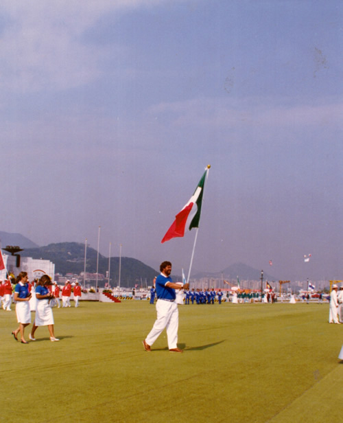 Alfio Peraboni portacolori alla cerimonia apertura Giochi Olimpici a Pusan, Corea del Sud