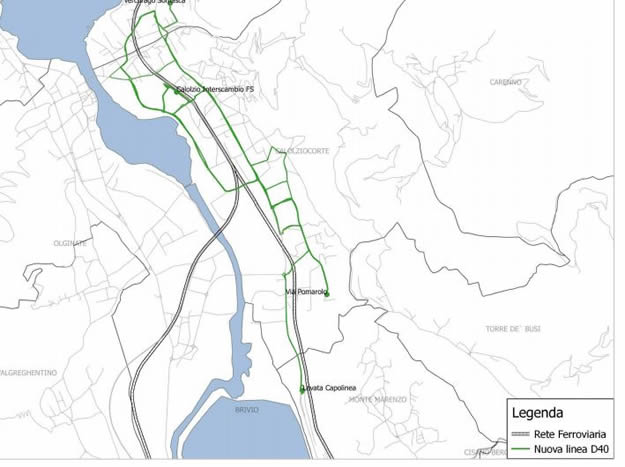 L'ipotesi progettuale - si legge nel documento - prevede la limitazione della linea VCB Vercurago-Calolzio-Bisone al capolinea di Levata (Comune di Monte Marenzo) transitando dalla rotonda di Bisone per inversione di marcia. Contestualmente, la linea D40 Calolziocorte - Cisano Bergamasco, che presenta sovrapposizioni funzionali con la rete ferroviaria, verrà assorbita dalla nuova linea Vercurago-Bisone. Inoltre, si vuole istituire, all'interno della stessa linea D40-VCB, un percorso circolare all'interno del centro abitato di Calolziocorte, da effettuare con autobus di dimensione ridotta ( per servire la frazione di Somasca) e avente capolinea in via Pomarolo. Il numero di tali corse è previsto pari a 5 per 300 giorni di servizio l'anno.