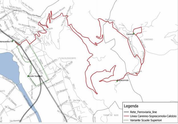 Nella linea Calolzio-Carenno-Sopracornola si prevede una "semplificazione" delle corse. Il progetto - come si vede nella cartina qui sotto - non prevede collegamenti diretti tra Carenno ed il poliambulatorio di Sala, che è utilizzato da tutta la Val San Martino ed in particolare dalle fasce più anziane della popolazione. I bus arriveranno dunque in stazione senza deviazioni e lì i passeggeri potranno sfruttare la "nuova circolare", senza dover acquistare un ulteriore biglietto.