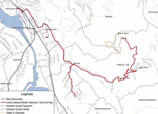 La linea Calolzio-Monte Marenzo-Torre de' Busi effettua il servizio tra le stazioni di Calolzio F.S e i comuni di Monte Marenzo, Torre de' Busi e le frazioni di Colle di Sogno (Carenno) e S. Marco (Torre de' Busi). Considerata la ridotta domanda di mobilità nella parte terminale della linea l'ipotesi progettuale prevede la soppressione del tratto tra Sogno e Colle di Sogno con capolinea alternato alle fermate di San Marco e Sogno. Si prevede, inoltre un sistema a chiamata/prenotazione nel tratto Sogno-Colle di Sogno.