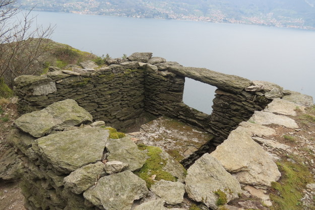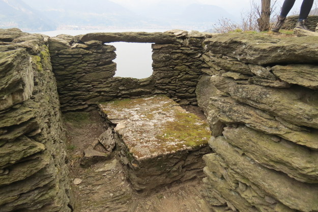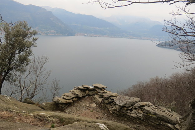 Ce lo testimonia anche il grosso basamento di sassi e pietre che incrociamo più avanti: si tratta della "stazione" di arrivo della teleferica - ben protetta entro una fessura naturale - che avrebbe dovuto trasportare uomini, armi e munizioni da Corenno fino alla cima della rupe. Il comodo sentiero che si percorre oggi, che sale tra campii e pendii, sarebbe stato infatti troppo esposto ai proiettili nemici.
