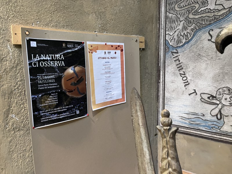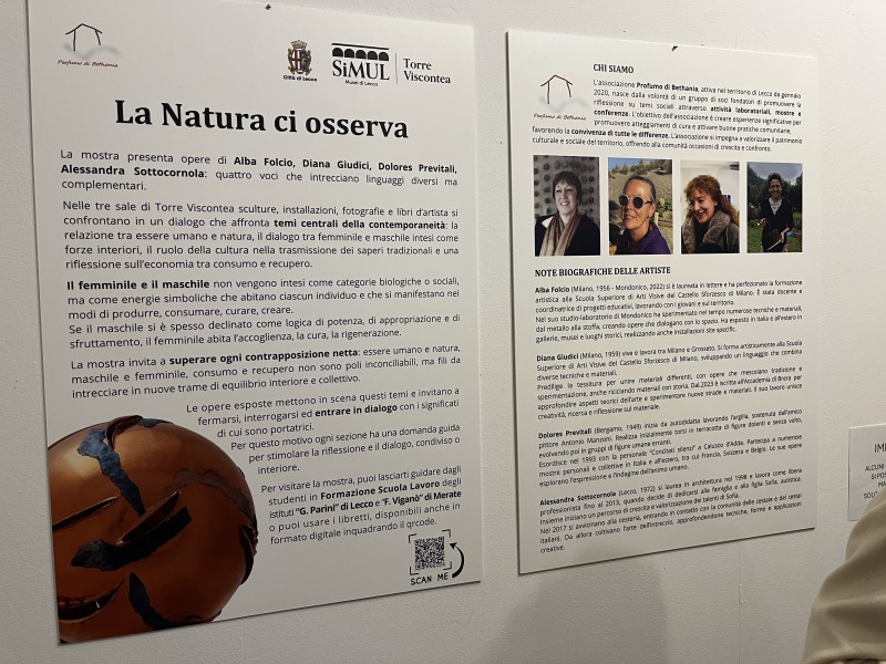 Primo fine settimana di apertura, in Torre Viscontea, per la mostra “La natura ci osserva”, promossa e curata dall'associazione Profumo di Bethania con il Comune e il Sistema museale urbano lecchese. Un percorso corale che riunisce pittura, scultura, installazione e fotografia di quattro artiste legate al territorio: Alba Folcio, Diana Giudici, Dolores Previtali e Alessandra Sottocornola. Le loro opere sono state affiancate da una selezione di preziosi libri firmati Pulcinoelefante.