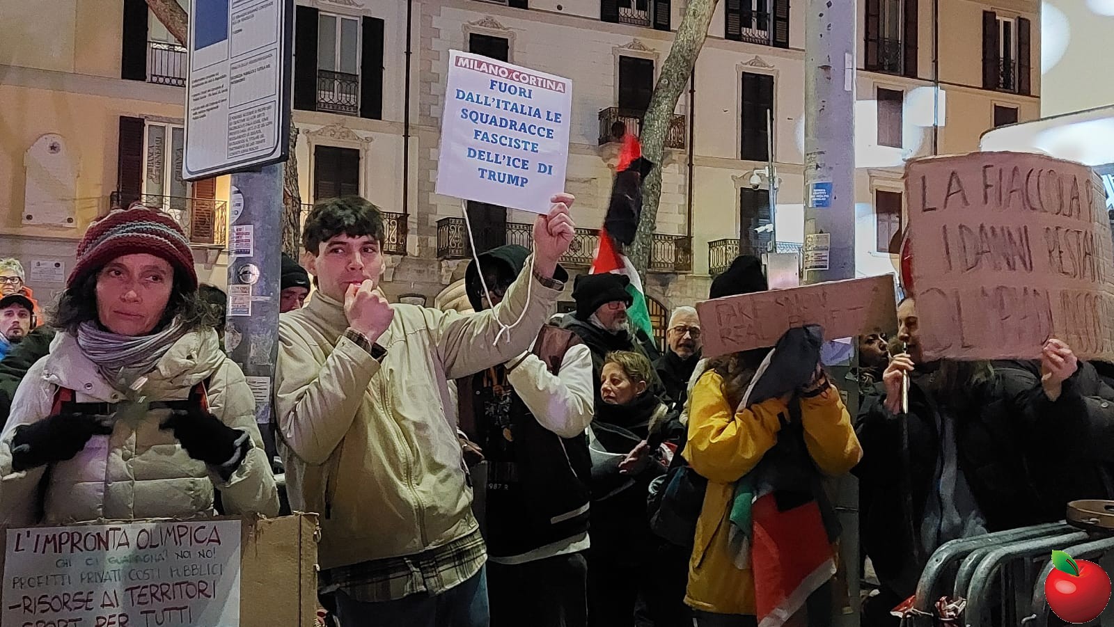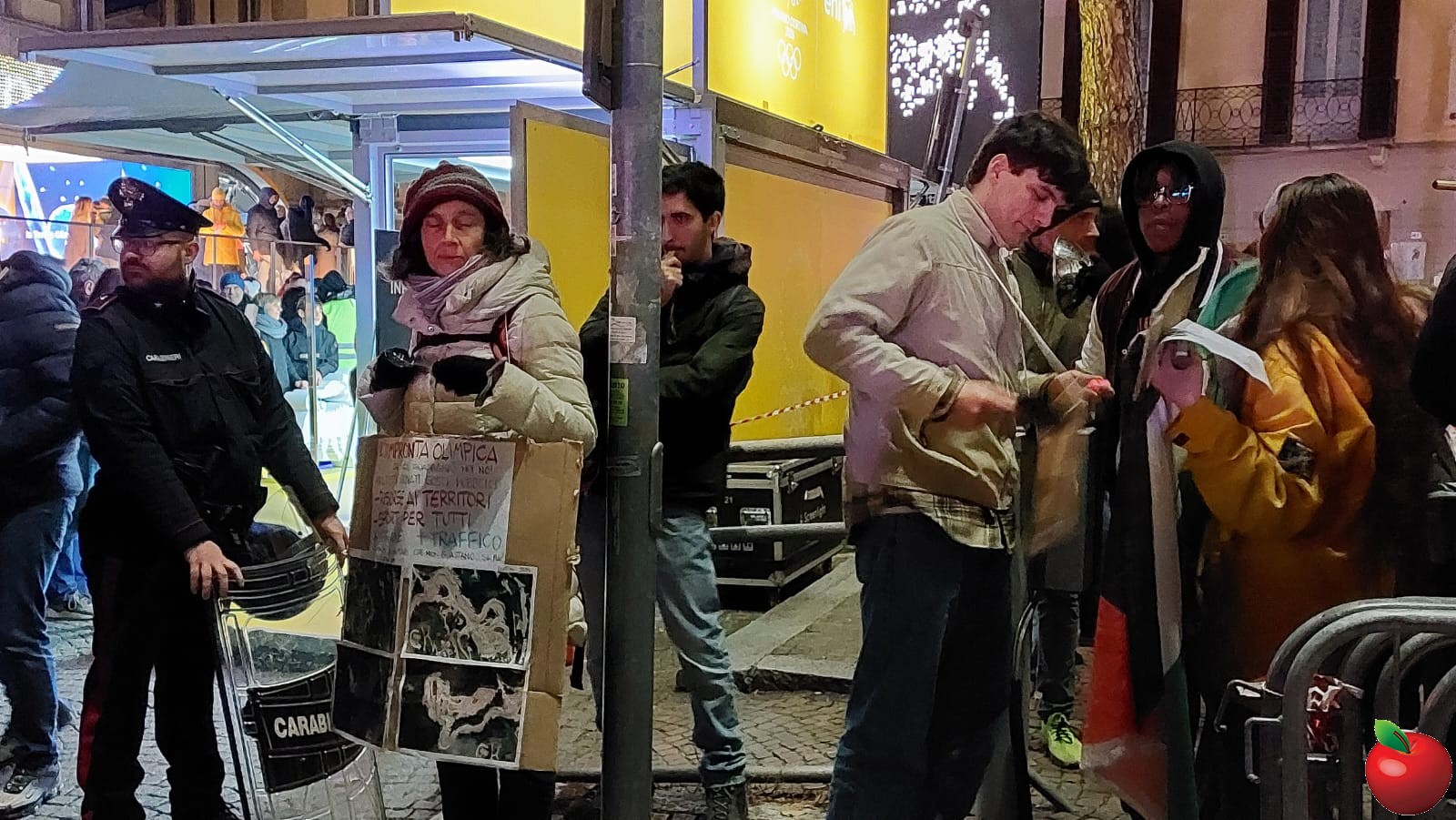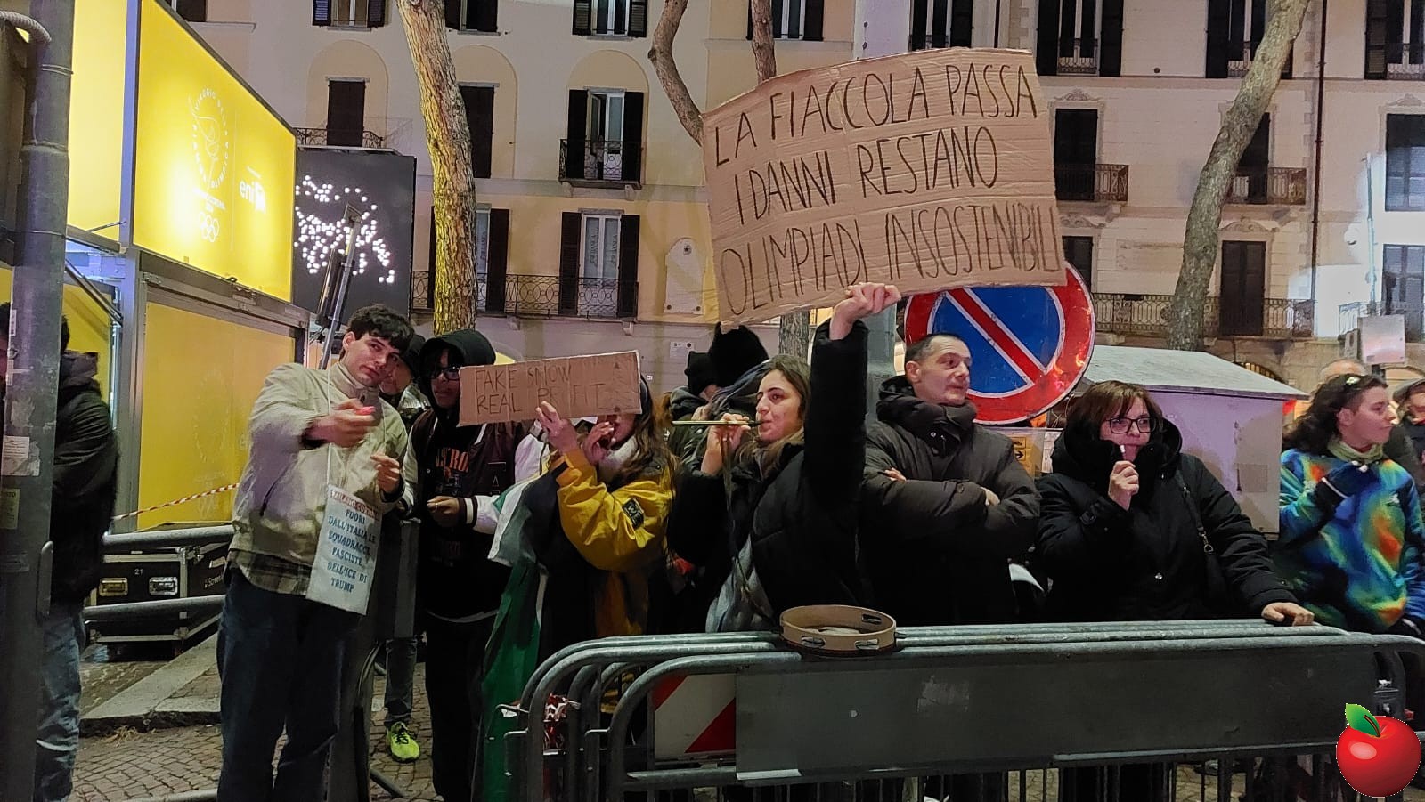 È una protesta contro le Olimpiadi considerate poco sostenibili, che si svolge senza tensioni, in silenzioso contrasto con la festa. Due immagini che convivono nello stesso spazio, restituendo la complessità del presente.